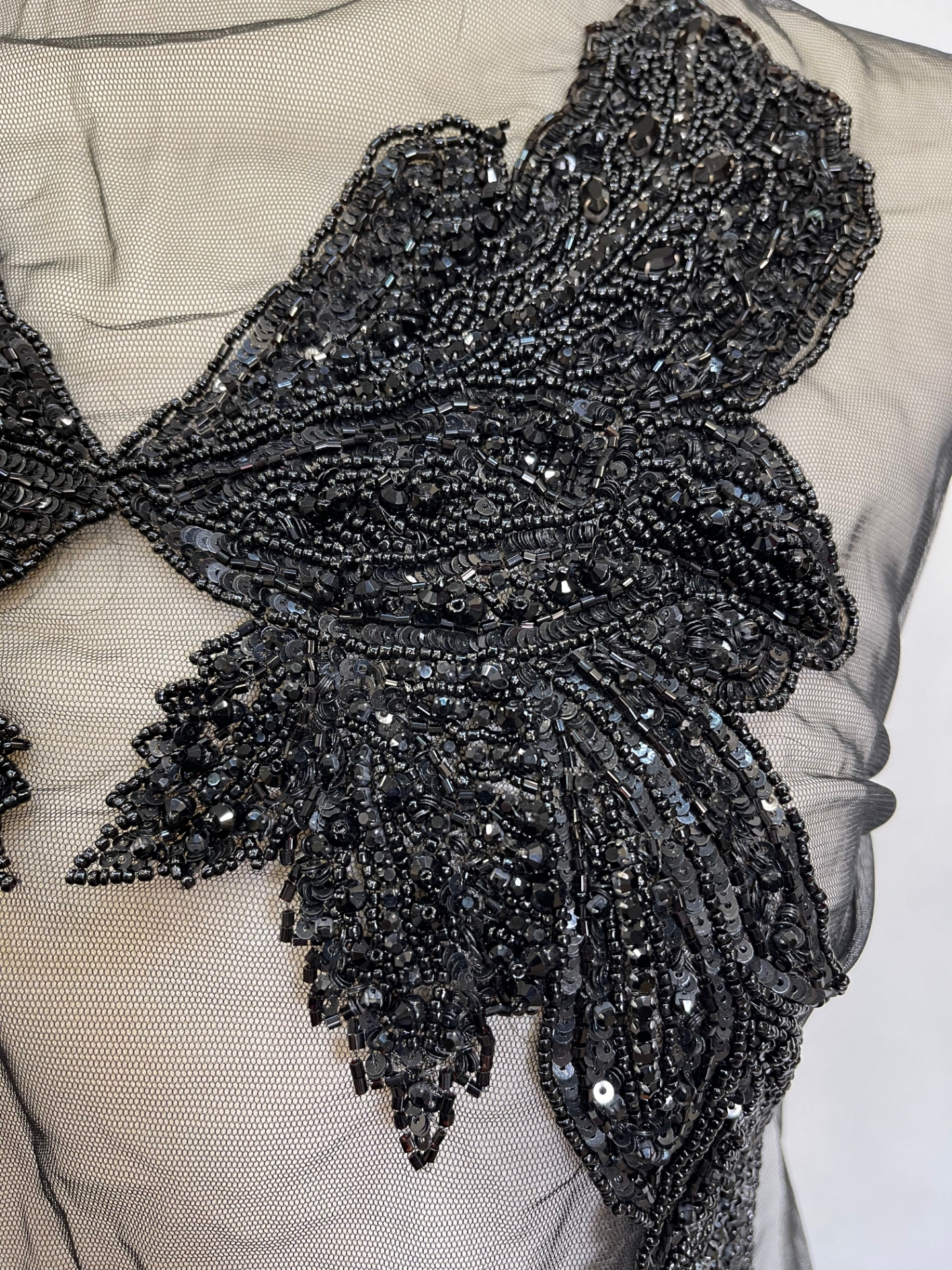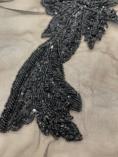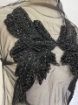 Handcrafted bust panel embellished with crystals, beads, and black sequins. Can be used to accessorize a dress, a blazer, or a denim/leather jacket. Length: 33 cm, width: 35 cm